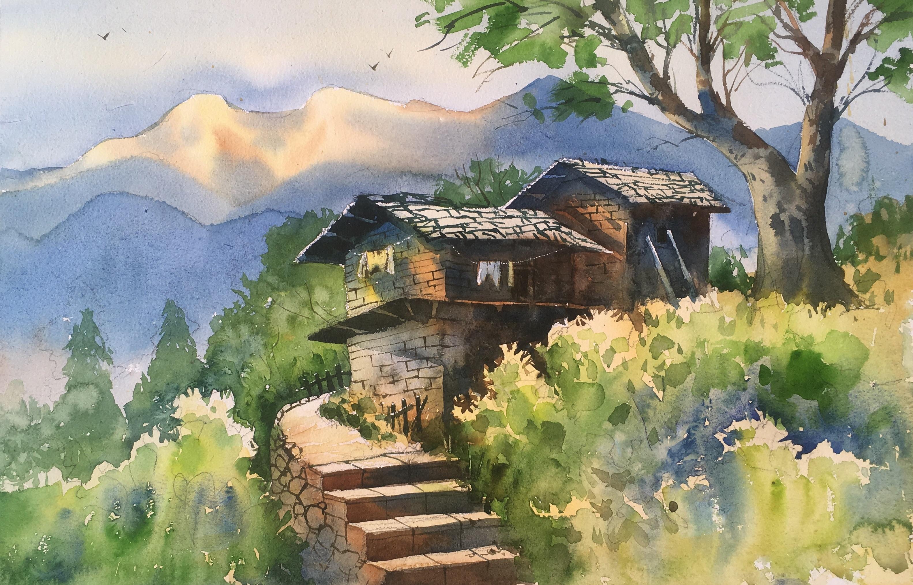 Beautiful Mountain Village Scenery Painting|Mountain Village Scenery Painting With Watercolor - Mountain Village Beautiful Village Scenery Painting